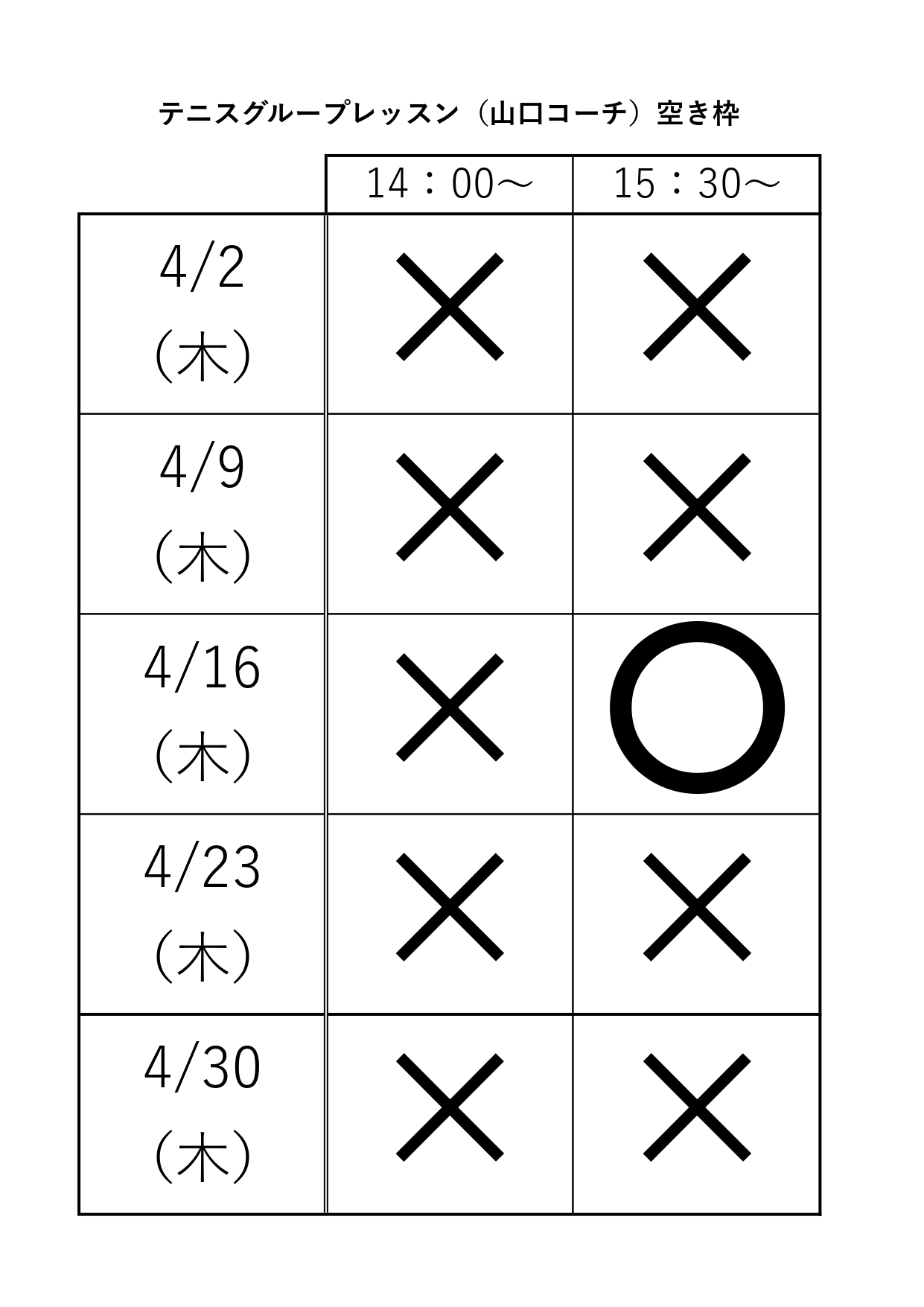 グループレッスン(木曜日)山口 久美子コーチのレッスンに空き枠があります。